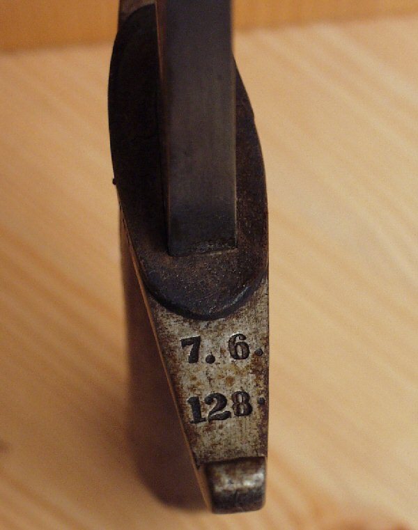 Später geschlagener Truppenstempel nach der "Vorschrift von 1877" auf der Parierstange und Tragehaken.