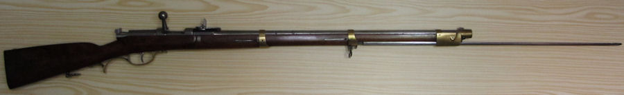 | Frontpartie einer Zündnadel-Pikenbüchse M54 mit voll ausgezogenem Pikenbajonett.(Seitenansicht) |