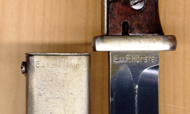Herstellerstempel auf Bajonett und Scheide: E.u.F. Hörster Abnahmestempel: Griffstück: WaA 25? , Bajonetthaltermutter: WaA ??? , Scheidenspitze WaA ???