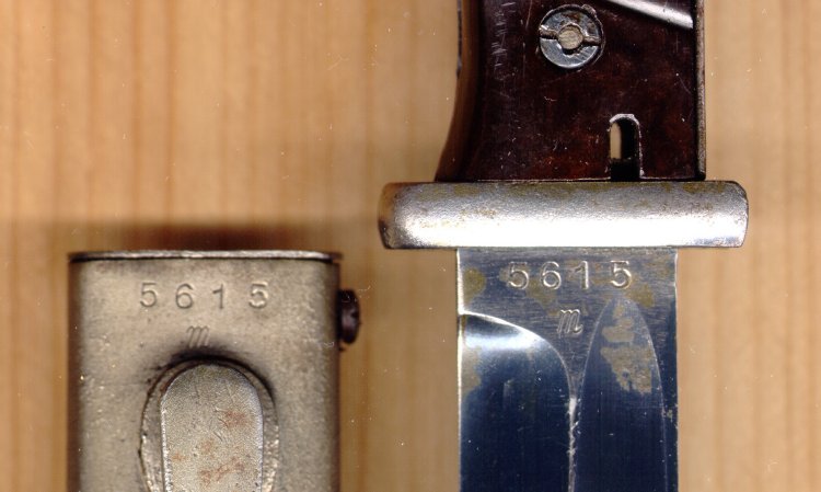 Seriennummer: Bajonett: 5615 m , Scheide: 5615 m (Nummerngleich) Klinge brüniert,Griffstück und Scheide überarbeitet (Gesandstrahlt ??) Griffschallen: Bakelit