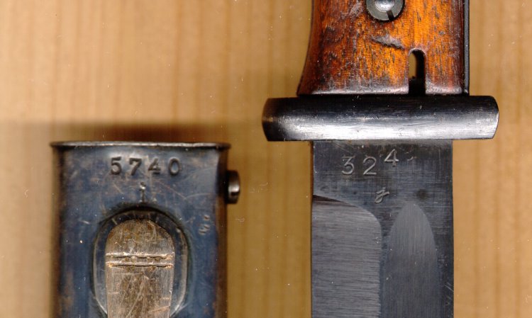 Seriennr.:Bajonett: 3241 j , Scheide: 5740 i Griffschalen: Holz